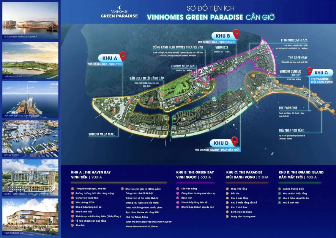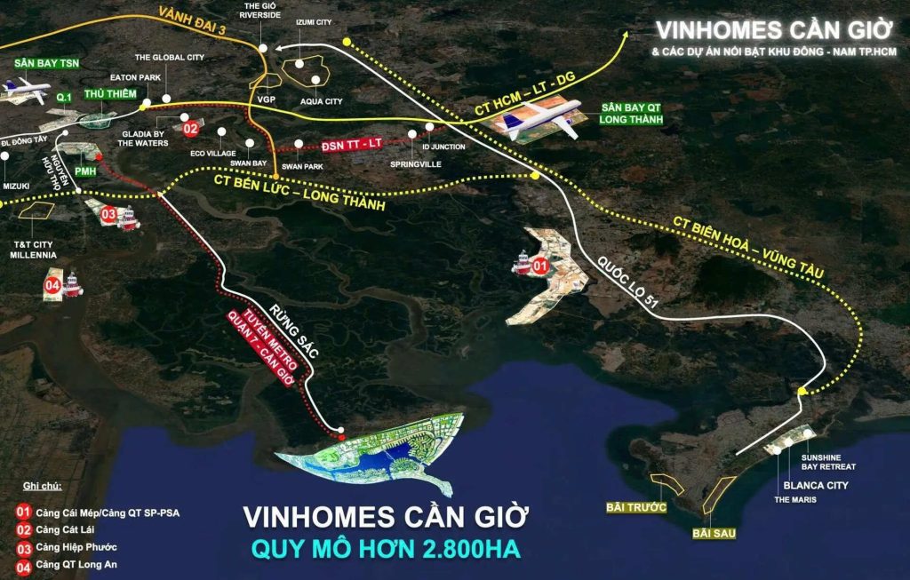 - Cảng Quốc Tế Cần Giờ: Cảng trung chuyển quốc tế Cần Giờ với công suất 100 triệu tấn hàng/năm sẽ trở thành cảng lớn thứ 3 Việt Nam, tạo ra 200.000-300.000 việc làm mới với mức lương cao. Điều này có nghĩa nhu cầu nhà ở trong khu vực tăng mạnh, đẩy giá bất động sản Vinhomes Green Paradise tăng 200-300% trong 5-7 năm tới. Cư dân hiện tại sẽ hưởng lợi từ làn sóng tăng giá này mà không cần đầu tư thêm bất kỳ chi phí nào.